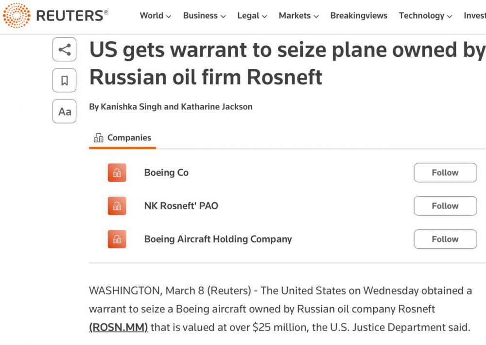 ⚡️⚡️США отримали ордер на арешт літака, який належав компанії «Роснефть» вартістю $25 млн.