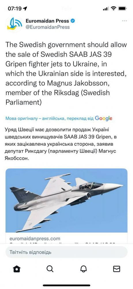 🔥Уряд Швеції має дозволити продаж Україні шведських винищувачів SAAB JAS 39 Gripen, в яких зацікавлена українська сторона, – депутат Риксдагу (парламенту Швеції) Магнус Якобссон.