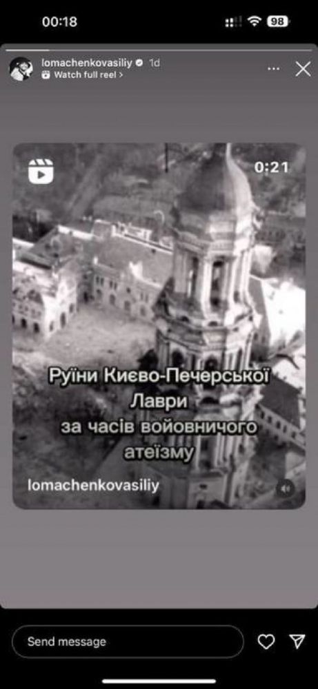 На этот раз спортсмен поделился видео, в котором идет сравнение с состоянием Киево-Печерской лавры во время Второй мировой войны и состоянием под руководством УПЦ МП. В видео использованы фото бомбардировок немецкими нацистами киевских храмов.