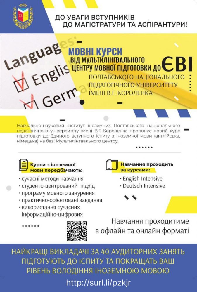 Навчально-науковий інститут іноземних Полтавського національного педагогічного університету імені В.Г. Короленка пропонує новий курс підготовки до Єдиного вступного іспиту з іноземної мови (англійська, німецька) на базі Мультилінгвального центру.