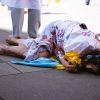 Одягнуті у саморобні білі плаття зі слідами «крові» на них дівчата синхронно лягли посеред площі, символізуючи жертв сексуального насильства, здійсненого російськими вояками в Україні.