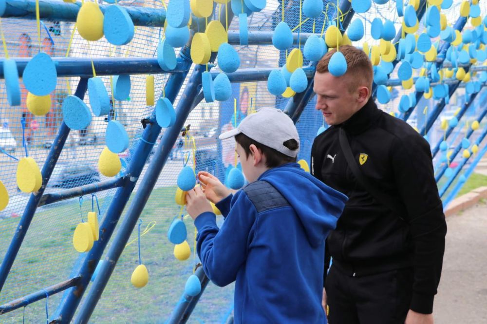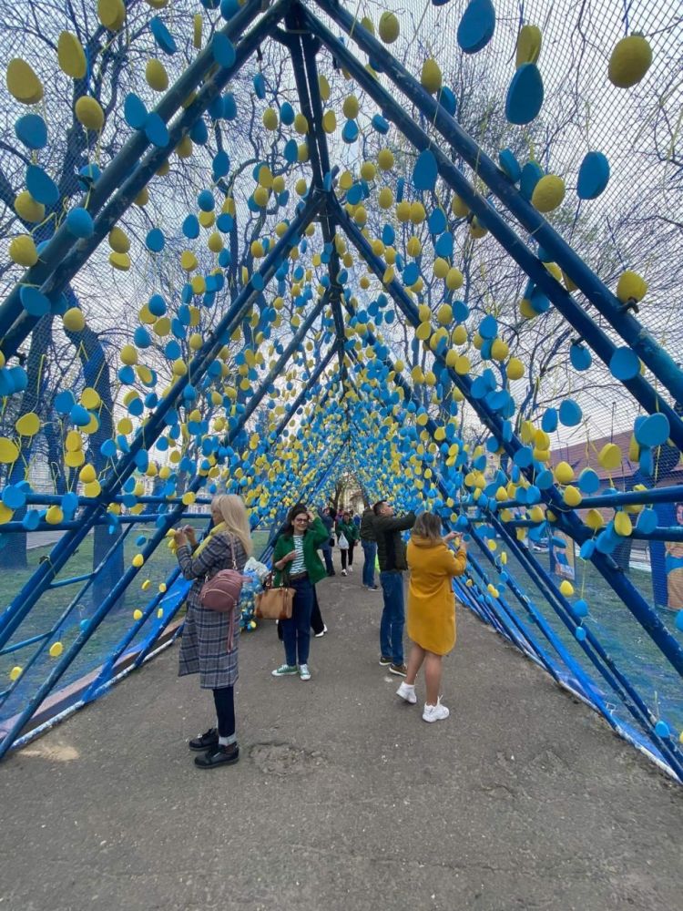 П’ять тисяч синіх та жовтих крашанок протягом трьох тижнів розфарбовували люди з Краматорська, Маріуполя, Рубіжного, Попасної та Сєвєродонецька. Ті, кому пощастило врятуватись. А розвішувати їх допомагали діти-переселенці.