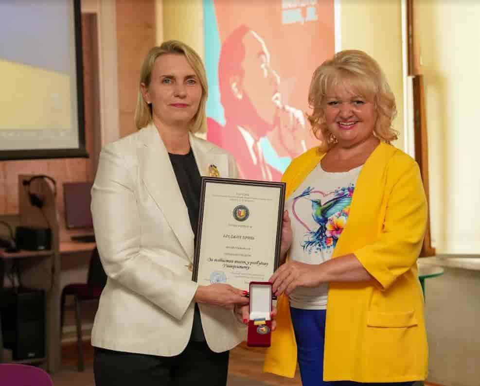 Марина Гриньова тепло подякувала Посольству США в Україні в особі Надзвичайного і Повноважного Посла Бриджит А. Брінк за плідну навчальну й наукову співпрацю, допомогу українським студентам через різноманітні освітні програми і гранти, вручивши почесний знак «За особистий внесок у розбудову Університету» – відзнаку, створену з нагоди 110-річчя ПНПУ, – пошанувавши тісні міжкультурні зв’язки між США та Україною.