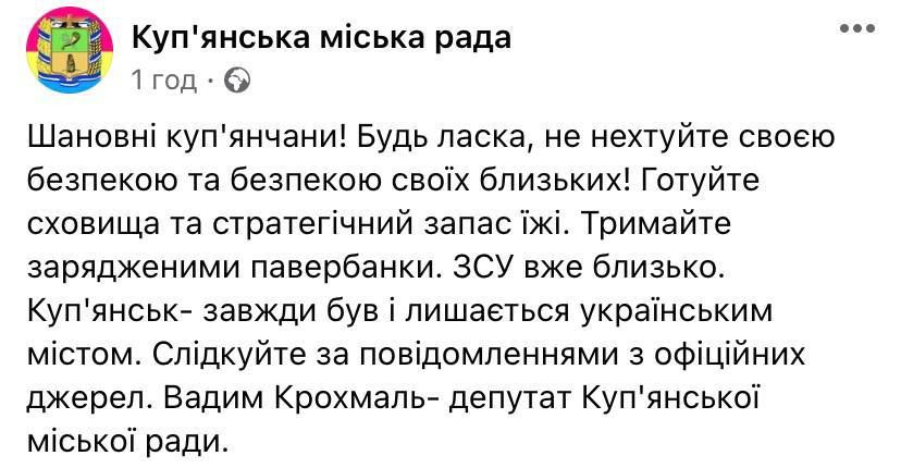 💪🏼 Мерія Куп'янська Харківської області вперше за 5 місяців вийшла на зв'язок та закликала мешканців міста запастися їжею та водою.