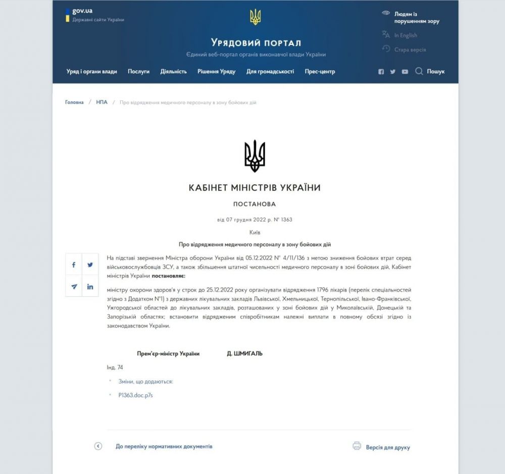 Соцмережами поширюють фото постанови Кабінету Міністрів України від 7 грудня про відрядження 1796 лікарів із державних лікувальних закладів «Львівської, Хмельницької, Тернопільської, Івано-Франківської та Ужгородської» областей до лікувальних закладів у Миколаївській, Донецькій та Запорізькій областях. У повідомленні йдеться, що Кабінет Міністрів України видалили постанову через декілька хвилин, після її публікації.