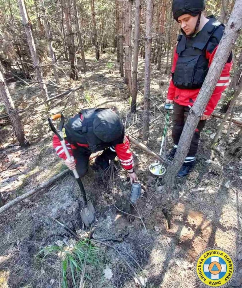 Так 1 травня п’ять піротехніків "Київської служби порятунку" протягом дня обстежили близько 0,5 га території Святошинського лісництва і виявили частини від боєприпасів РСЗВ "Град".