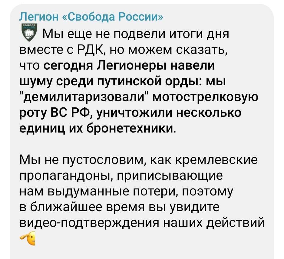 Легіон «Свобода росії» заявив про ліквідацію мотострілкової роти зс рф та знищення кількох одиниць військової техніки